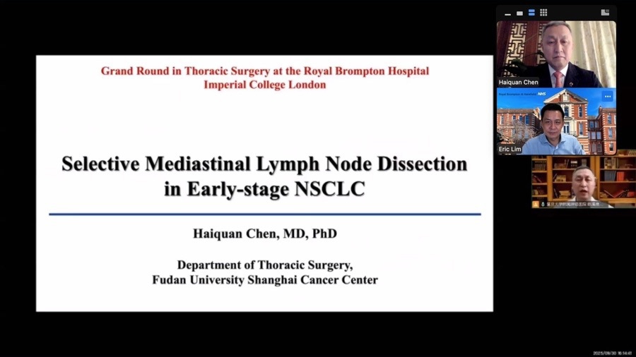 北京时间10月3日下午3点,复旦大学附属肿瘤医院胸外科主任陈海泉教授受邀在英国帝国理工学院附属皇家布朗普顿医院多多策略,在“线上大查房”环节分享了主题为:磨玻璃肺结节淋巴结清扫的“中国经验”。这也是陈海泉教授继两度登上“哈佛讲坛”后,再次受邀在国际顶尖医学中心分享中国肺癌专家的前沿创新成果,代表国际顶尖医学中心对中国胸外科领域学者和肺癌诊治“中国经验”的高度认可。