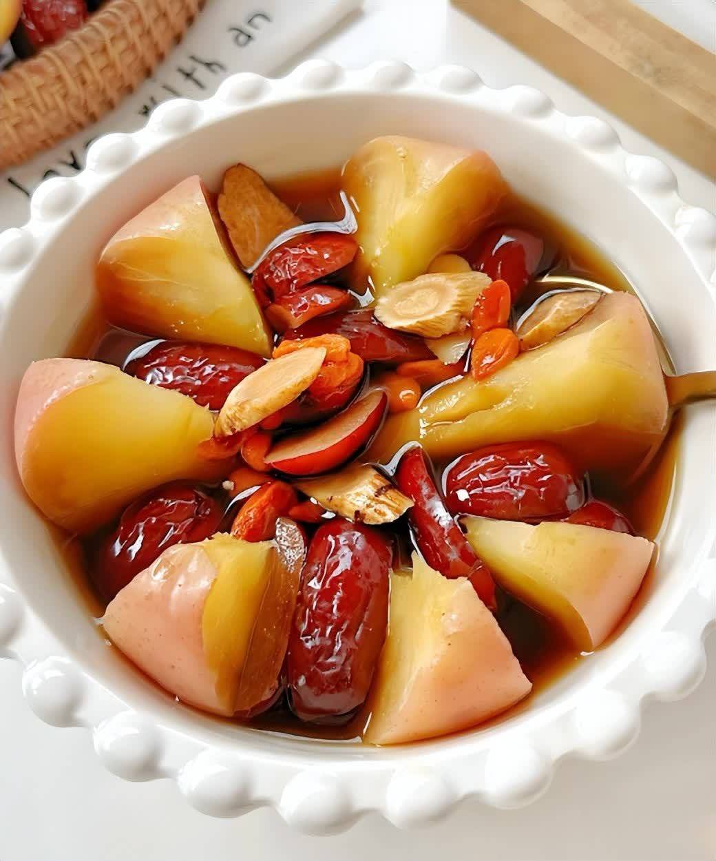 5. 炖煮:将炖盅盖好,放入蒸锅或炖锅中,用中小火炖煮大约30-40分钟,直至苹果软烂,汤汁浓郁。如果使用炖盅,也可以用烤箱低温慢炖。