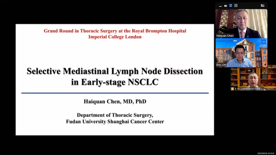 北京时间10月3日下午3点,复旦大学附属肿瘤医院胸外科主任陈海泉教授受邀在英国帝国理工学院附属皇家布朗普顿医院,在“线上大查房”环节分享了主题为:磨玻璃肺结节淋巴结清扫的“中国经验”。这也是陈海泉教授继两度登上“哈佛讲坛”后,再次受邀在国际顶尖医学中心分享中国肺癌专家的前沿创新成果。